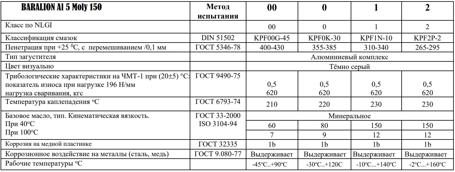 Применение: BARALION Al 5 Moly 150 - идеальна для деталей горнодобывающего оборудования таких как: зубчатые рейки, валы и направляющие корпуса, рукояти ковшей экскаваторов, закрытые редукторы, а также рекомендуется для использования в медленно движущихся подшипниках и втулках.